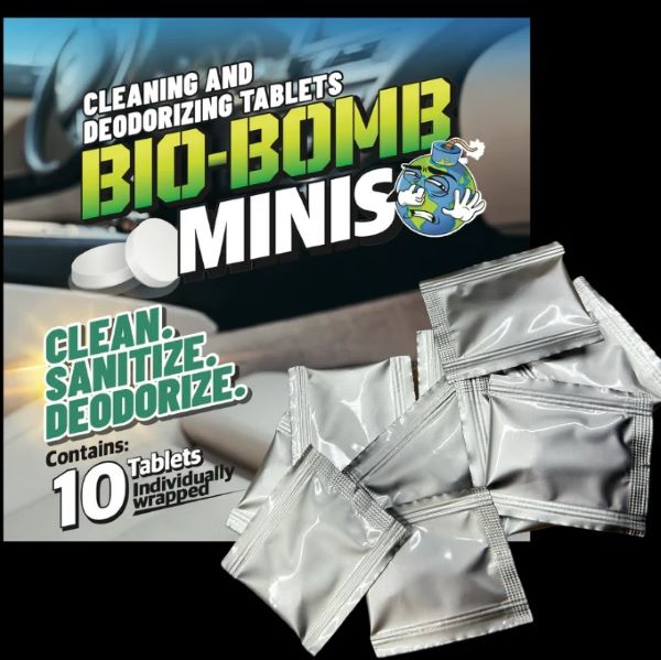 Bio-Bomb Minis simplifies your cleaning routine by offering a powerhouse trio: cleaning, deodorizing, and sanitizing, all in one. The ultimate cleaning solution – Drop one tablet into a spray bottle of water, and watch it dissolve into a versatile cleaning spray that’s safe for all surfaces. Simply spray on and wipe off to remove odor molecules and grime with ease! Supercharge your steamer or extractor! A single Bio-Bomb Mini per 32 oz. of water creates a potent solution that penetrates deep into surfaces, fabric, and carpets. Works wonders on that moldy smell coming from your HVAC system too! Minis can be used on a variety of vehicle surfaces, including center consoles, steering wheels, dashboards, door panels, seats, carpets, trunks, and vents. Rest assured, Minis won’t stain or leave any residue, but they will obliterate funk on contact, leaving your space free from odorous bio-burdens. Minis works wonders on pet beds, sports equipment, smelly shoes, and even trash cans. Say farewell to unpleasant odors, and give your home a fresh, clean start.